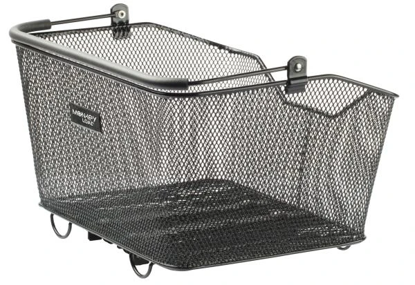 Feinmaschiger Hinterradkorb aus Stahl im Querformat, mit Sattelaussparung und gepolstertem Tragegriff. Ausgestattet mit dem neuen MonkeyLoad-T System.