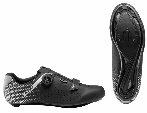Die vielseitigen Allrounder CORE PLUS 2 Rennradschuhe von NORTHWAVE bieten mit ihrer glasfaserverstärkten NRG AIR CARBON Nylonsohle eine optimale Kraftübertragung aufs Pedal. Durch die strategisch platzierten Belüftungsöffnungen und den Steifigkeitsindex von 8.0 bleiben deine Füße auch auf langen Touren kühl und trocken. Der überarbeitete S.L.W.3 Drehverschluss mit stufenloser Lockerung und kompletter Öffnung auf einfachen Knopfdruck sorgt für eine präzisere und einfachere Anpassung an deinen Fuß. Zusätzlich bietet der Schuh eine nahtlose BIOMAP UNIBODY-Oberschuhkonstruktion für eine bessere Passform und optimale Belüftung. Mit der REGULAR FIT Passform und dem zusätzlichen Klettverschluss bieten die Schuhe einen hohen Tragekomfort. Kompatibel sind sie mit Rennrad-Pedalsystemen, welche Schuhplatten mit 3-Loch-Standard verwenden.
