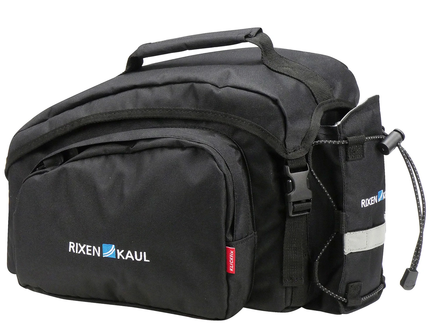 Formstabile Tasche mit gepolsterten Seitenwänden. Das Haupfach mit Doppel-RV wird von einer zusätzlichen Stoffklappe abgedeckt, unter der auch Jacke oder Pulli verstaut werden können. Das Flaschenfach an der Rückseite lässt sich mit Spanngummi flach anlegen. Mit Reflektor, Lampenhalter, Tragegriff und Regenhaube.