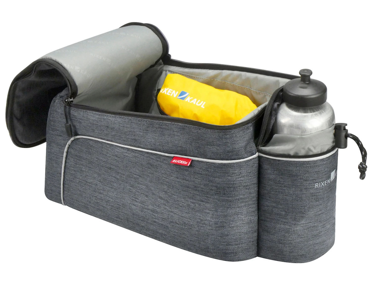 Schlanke, aber dennoch üppig ausgestattete Rackpack mit geräumigem, gepolstertem Hauptfach und Innentasche. Eine Trinkflasche kann in einer Außentasche verstaut und mit einem Kordelzug gesichert werden. Ausgerüstet mit Griff, Tragegurt, Reflektor und Regenhaube.