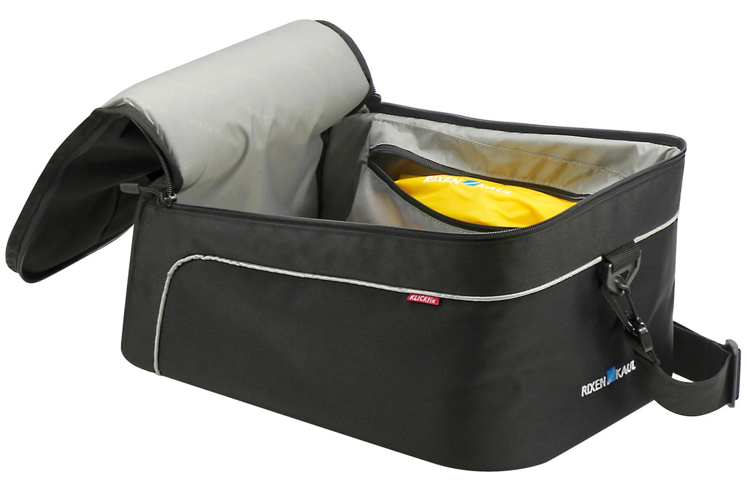 Extra geräumige Rackpack mit großem Hauptfach. Bietet Platz für größere Gegenstände wie Helm, Proviant, Unterlagen und Bekleidung. Ausgestattet mit Innentasche, Reflektor, Schultergurt, Regenhaube und Tragegriff.
