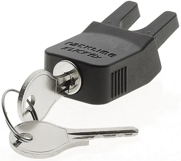Nachrüstbares Schloss für alle Racktime Adapter. Das Schloss wird auf die Taste des Racktime Adapters aufgesteckt und verriegelt so das Zubehör am Gepäckträger.